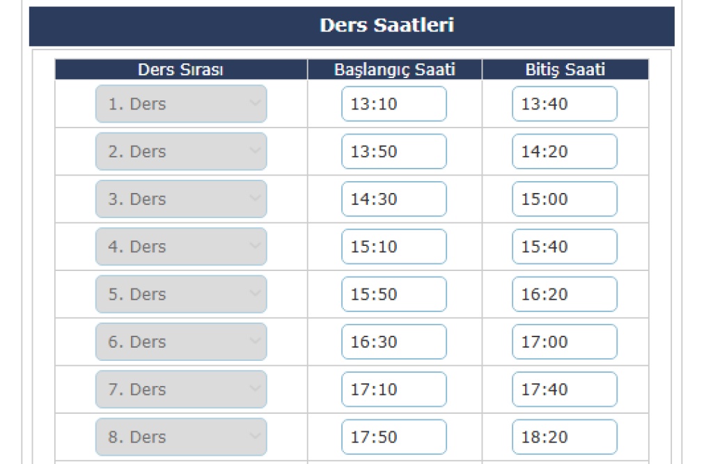Okulumuz ders saati süreleri Kayseri Valiliği'mizin 15/09/2025 tarih ve E-52811332-020-140783045 sayılı Makam Olur'u ile 30 dakika olarak aşağıdaki gibi güncellenmiştir.